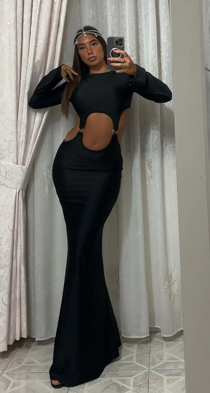 Sballa la tua silhouette in questo elegante abito lungo nero. Il suo design a sirena aderente ti valorizzerà le curve, mentre la pancia e la schiena scoperta aggiungeranno un tocco di sensualità al tuo look. Perfetto per occasioni speciali, serate di gala o un’uscita elegante.