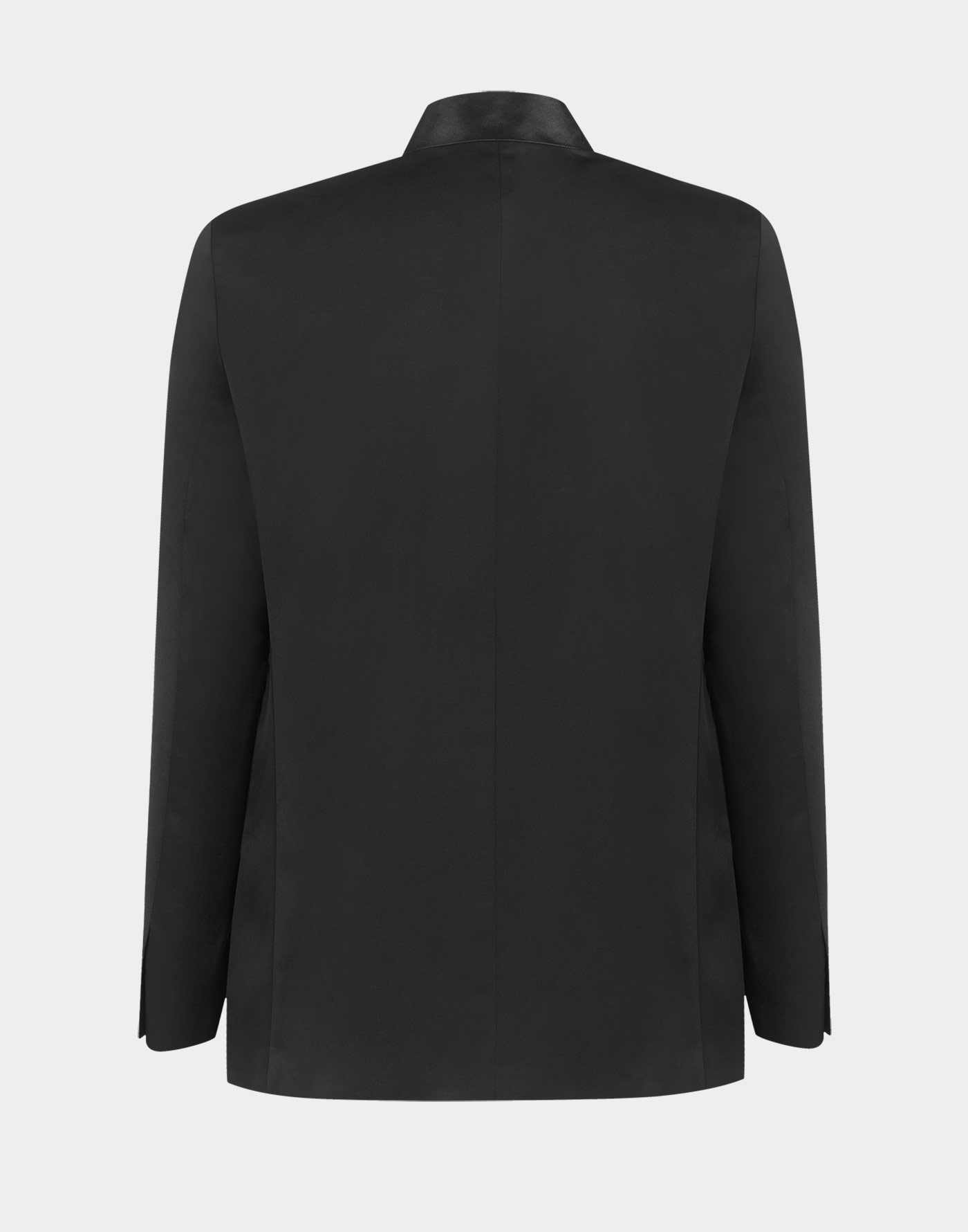La giacca ha il colletto alla coreana, con chiusura a un bottone e caratterizzata da finiture in raso su tasche e bottoni.
