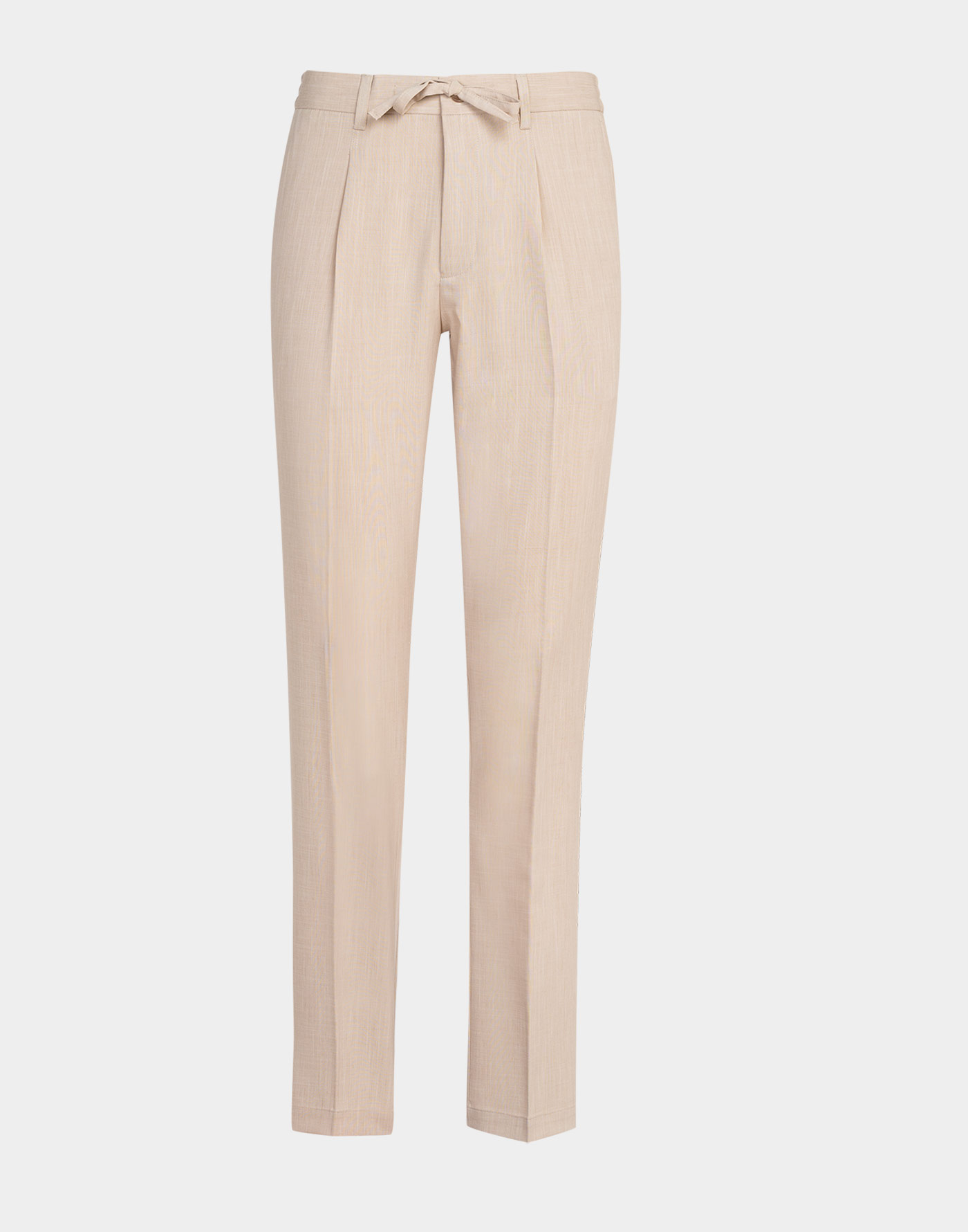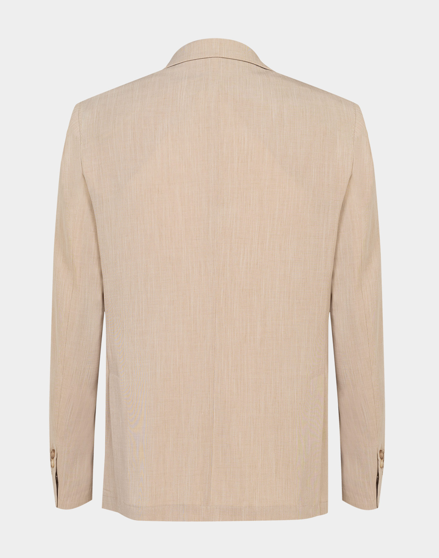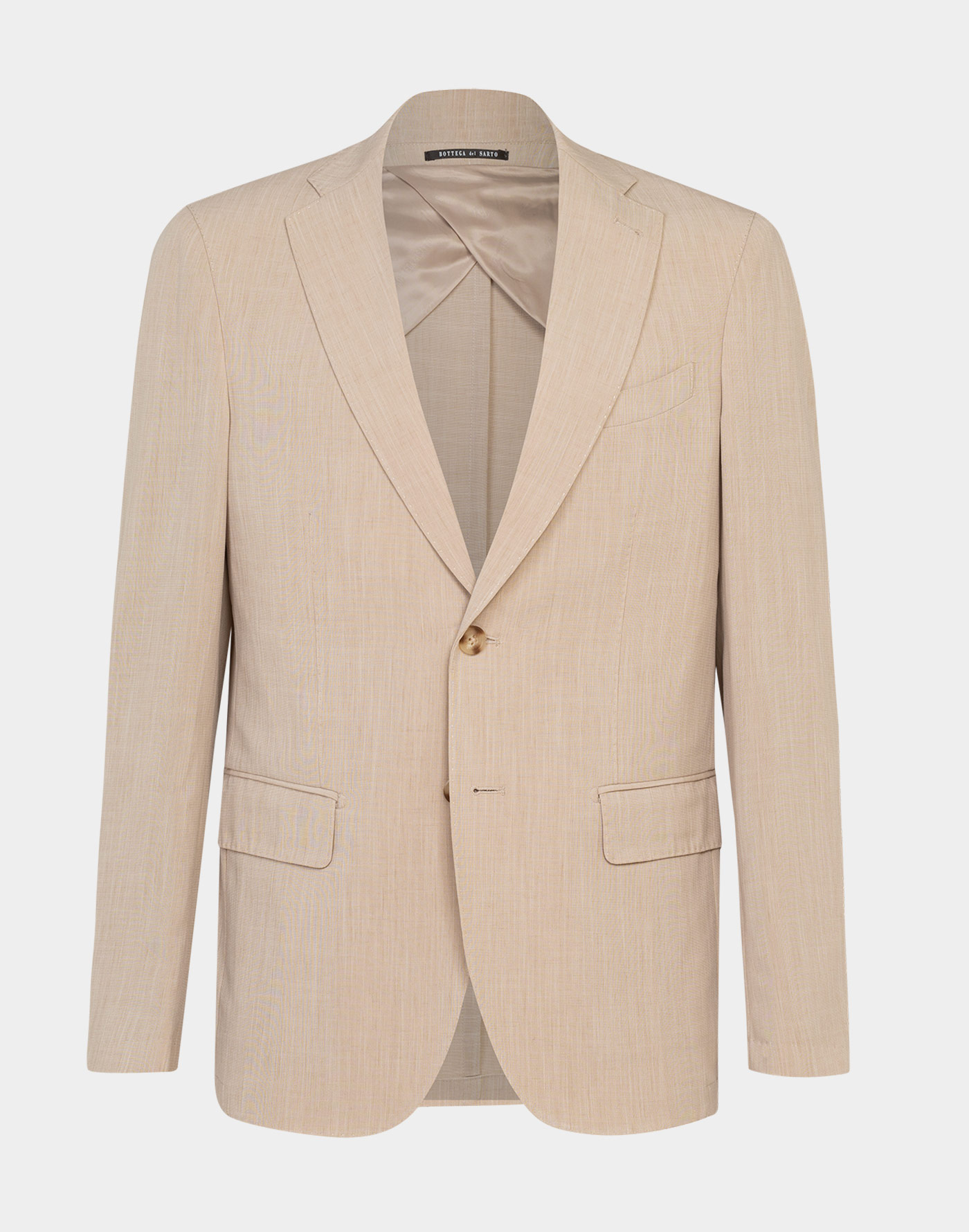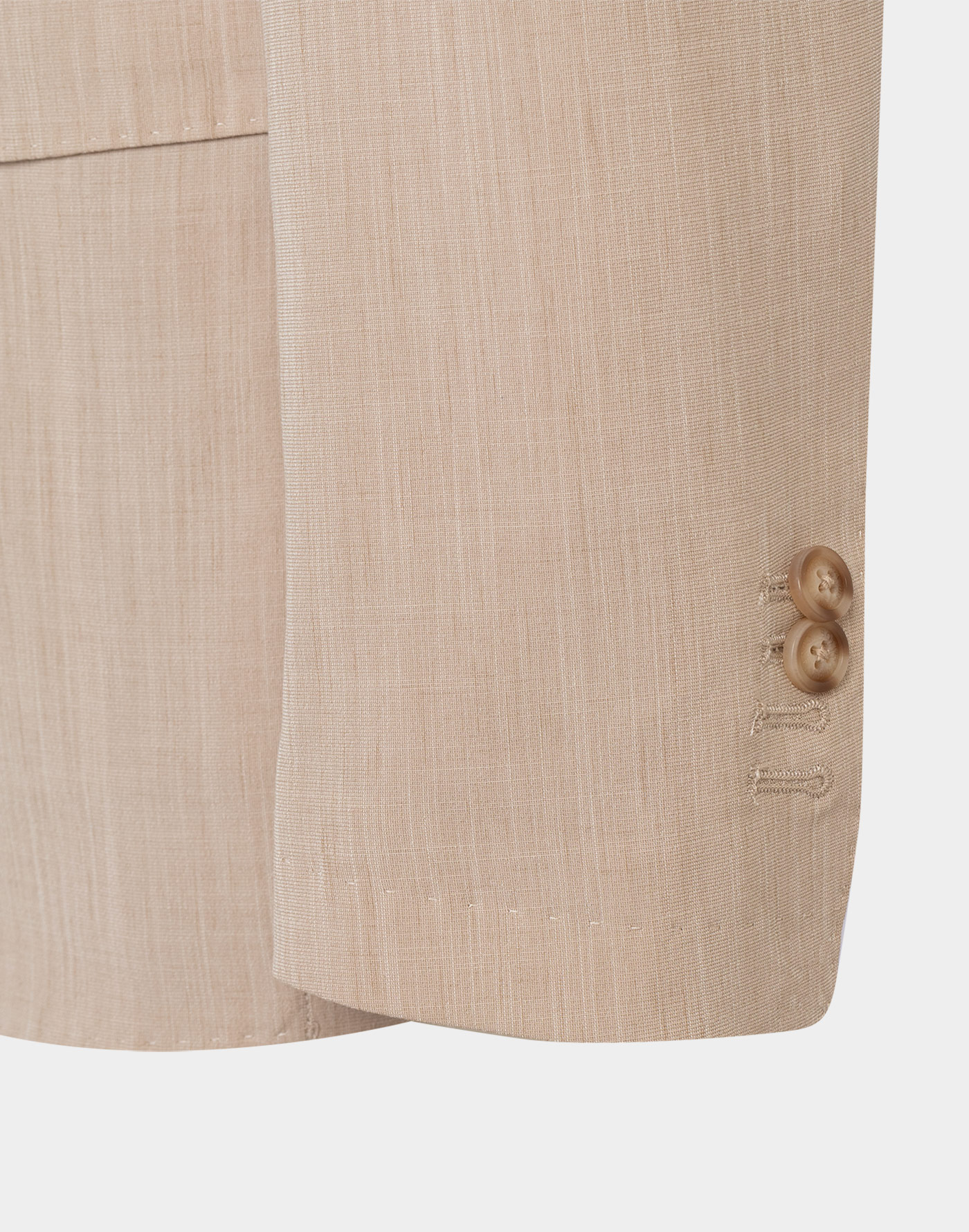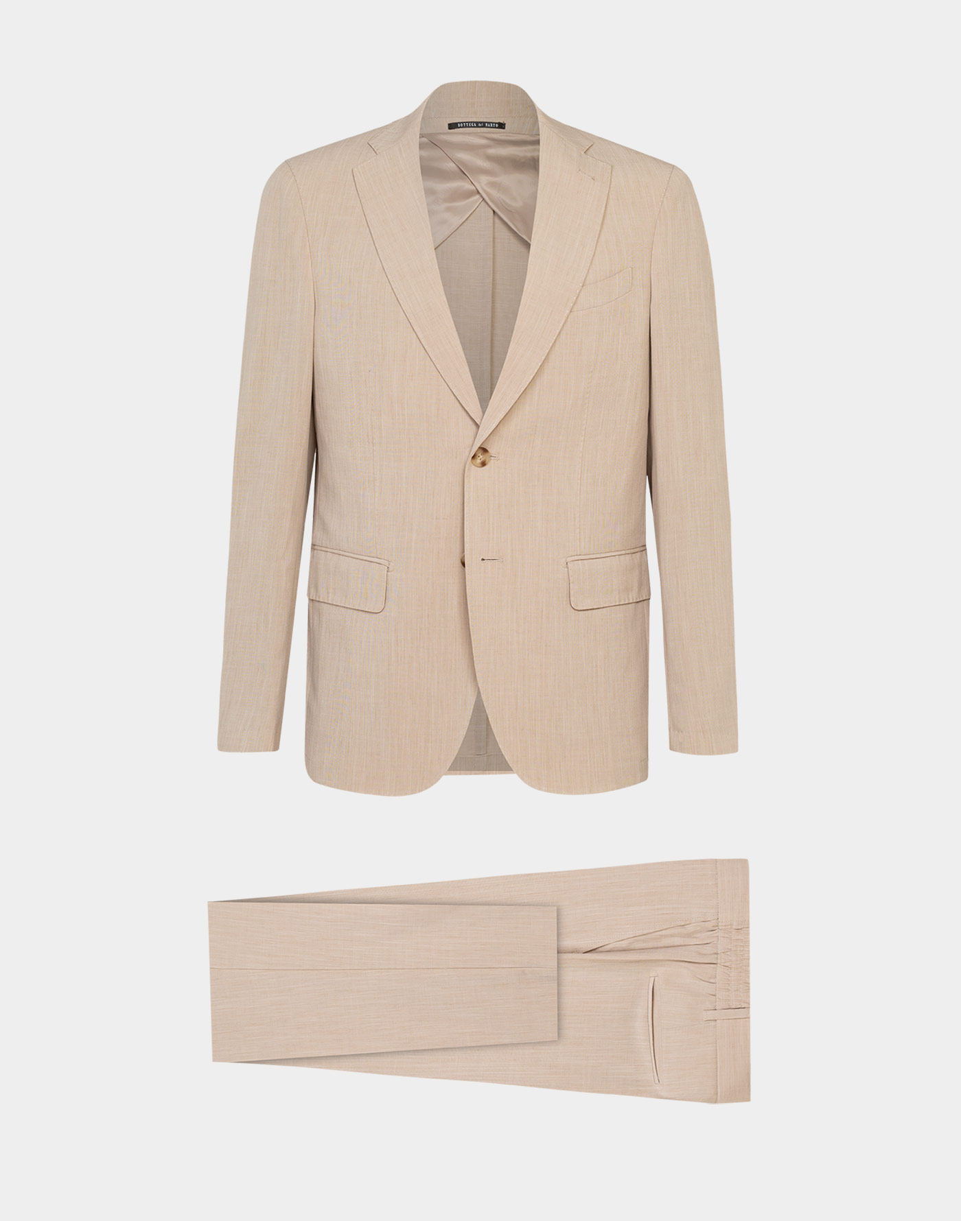 Abito monopetto in tela di lino beige. Realizzata con tessuti superleggeri e altamente performanti, unisce leggerezza, elasticità naturale e struttura sartoriale. Il tessuto avvolge la silhouette garantendo comfort, traspirabilità e versatilità, ideale dall’ufficio ai viaggi.